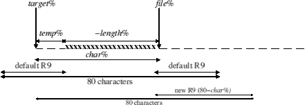 The diagram illustrates the case when the found string is so close to the start of the paragraph (the dashed line) that there is no room to add R9 characters at the beginning, i.e. when temp% < R9. At the bottom is shown the new value of R9 necessary to be added at the end if a length of 80 characters starting from target% is still to be obtained; it should be evident from the diagram that this value is given by (80-char%).