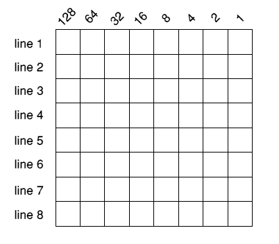All the characters in the system font are defined on an eight-by-eight grid, like this :