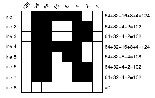 Eight bytes are required to describe a character - one for each line. Each line is calculated by adding the values of each column that is used, as shown by this example :