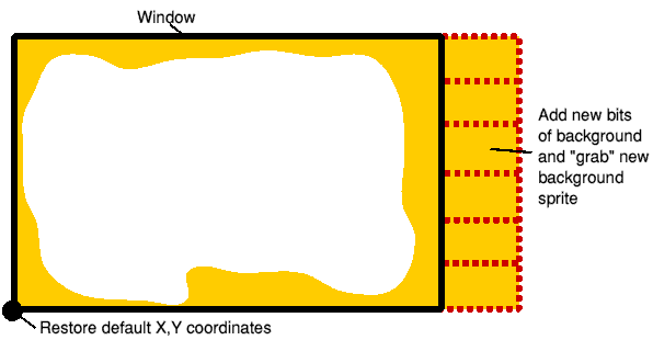 Apart from that, another really good way of scrolling is open to us owing to the 32-bit speed  that is plotting a large background sprite in a window and replotting it a bit further left each time we want to simulate a background scrolling in that direction. The diagram shows how this can be done and how extra background is added when needed.